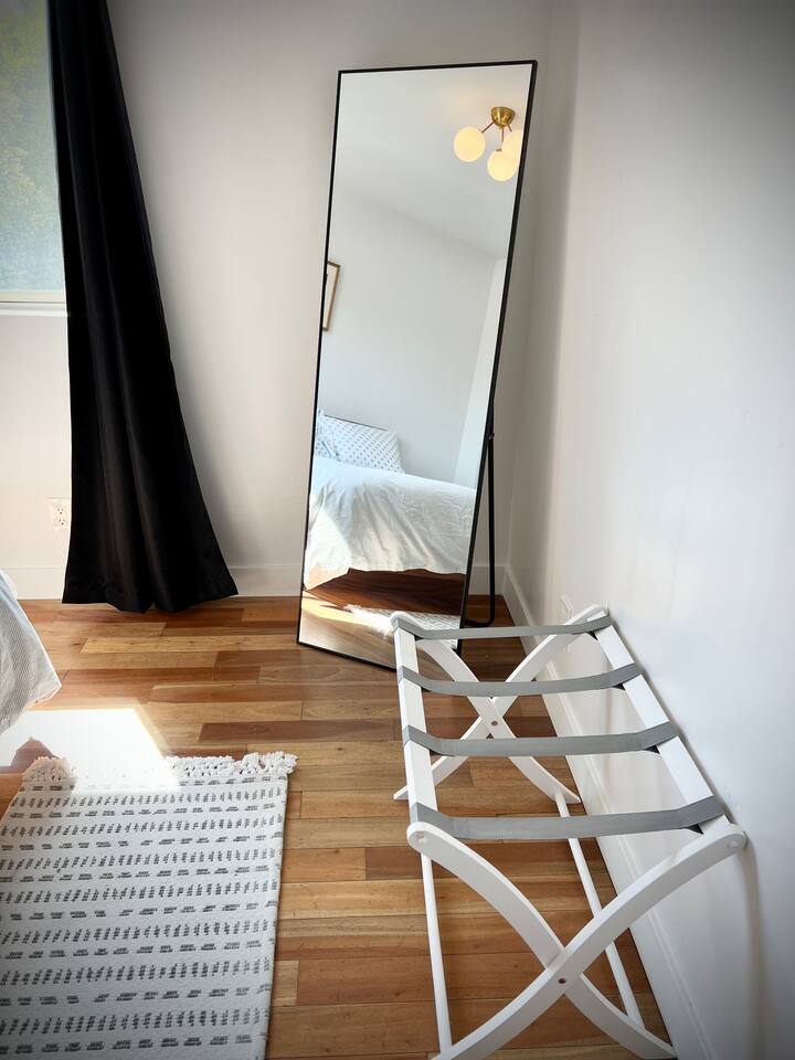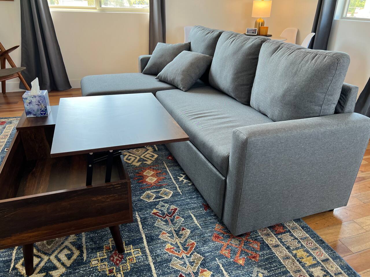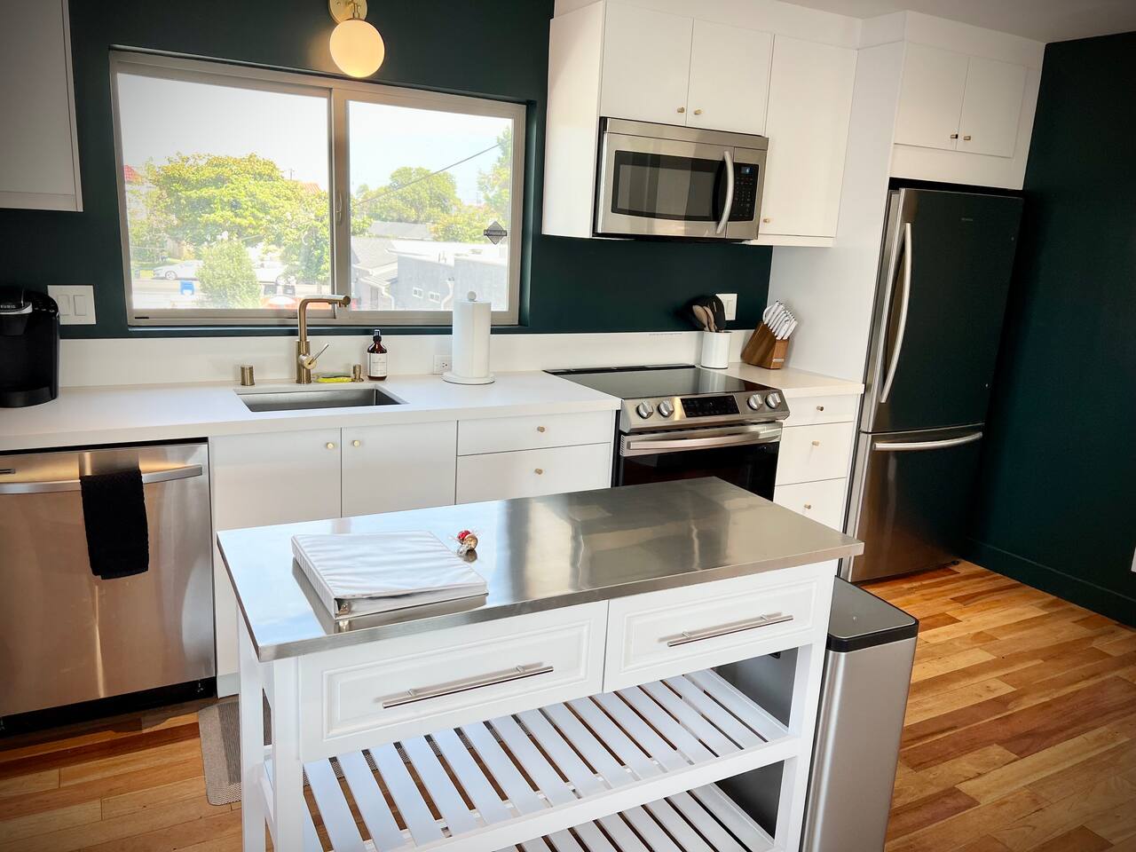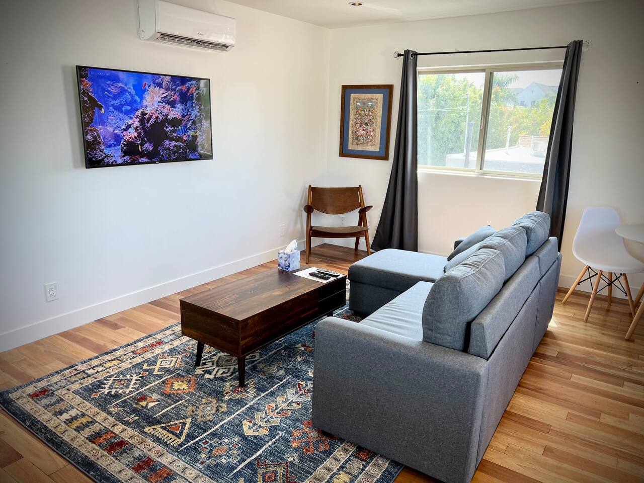 Includes one safe, off-street parking space, high-speed WiFi, a living room with dining area, 55" Smart TV, full kitchen w/dishwasher, oven/stove and combo washer/dryer, Alexa voice assistant/speaker, comfy queen size bed, full-size modern bathtub/shower, and a fold-out sofabed for an additional guest if needed.
